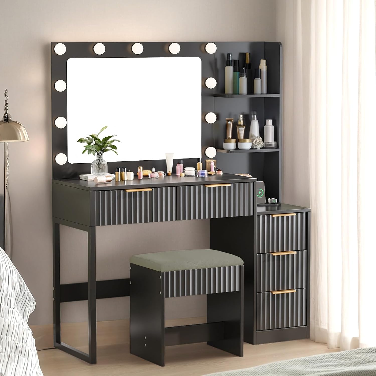 Upgrade Your Beauty Routine with Our All-in-One VanityDiscover your perfect beauty station, designed to organize your space and simplify your routine. This vanity combines modern style with smart functionality! Modern Design: The sleek slatted-panel front adds contemporary flair, complementing any bedroom decor. Smart Storage: Features 7 drawers and 4 open shelves to keep all your makeup, brushes, and skincare neatly organized and within reach on the 15.6-inch wide top. Adjustable Lighting: Choose from 3 light modes (cool, warm white, warm yellow) for clear, accurate visibility day or night. Complete Set: Includes a comfortable padded stool that tucks away and a built-in charging station with USB, USB-C, and AC outlets. Ideal for daily use and makes a thoughtful gift. Create your clutter-free glam station today!