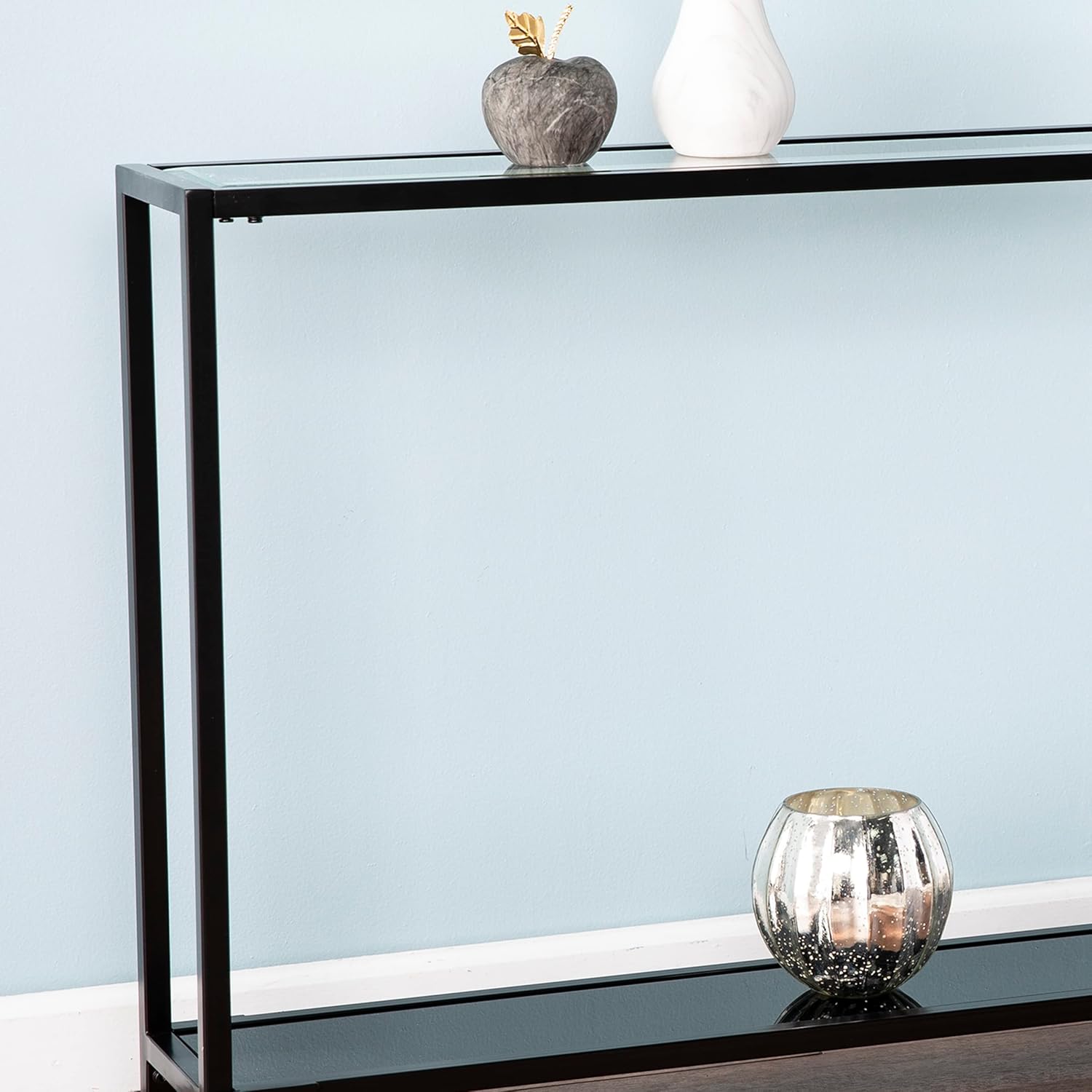 Blend glam style to any space with a touch of black nickel and glass in this anywhere console. The sleek, simple silhouettes with clear glass top shelf and black glass bottom shelf create two tiers of storage, enhancing formal and casual spaces. Narrow metal and glass media console adds drama under your wall mounted TV. Create a memory vignette with photos and accent items on your sofa table or shine a spotlight to a focal wall. This slim anywhere console, brings show-stopping style and storage to your home.