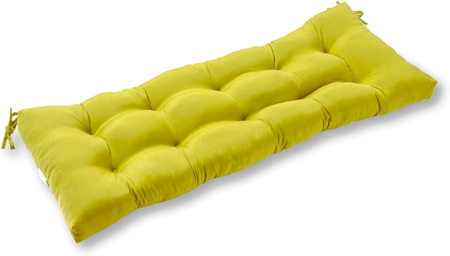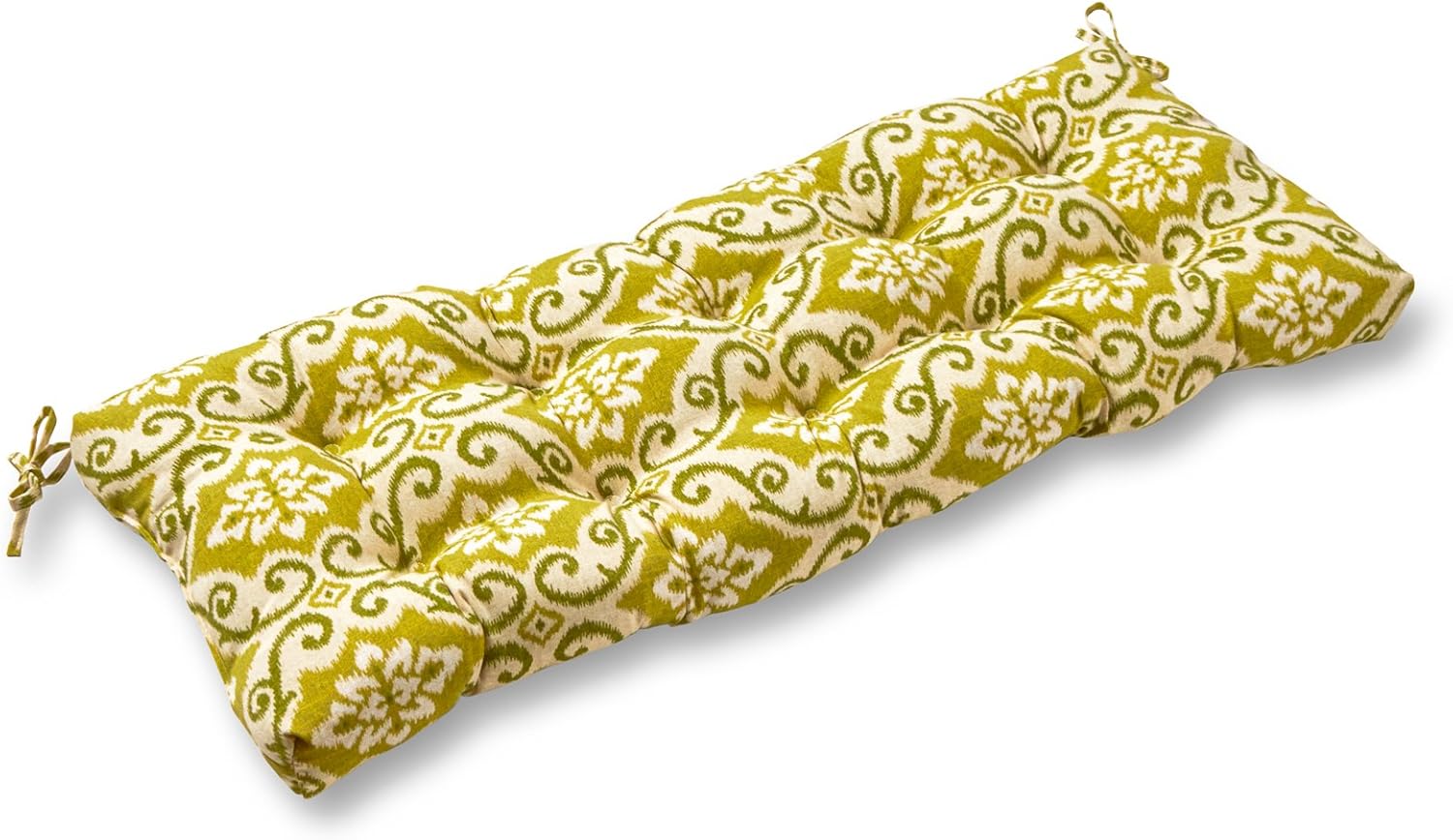 Enhance the look and feel of your patio furniture with this Greendale Home Fashions outdoor swing/bench cushion. This cushion measures 44" x 17" x 4", and comes with string ties to keep the cushion firmly in place. Cushions are circle tufted to prevent fill from shifting and bunching, and each cushion is overstuffed for extra comfort and durability with a soft polyfiber fill made from 100% recycled, post-consumer plastic bottles. Covered with a UV resistant, 100% polyester outdoor fabric, these cushions are resistant to water, stains, and fading. A variety of colors and prints are available to enhance your outdoor decor.Please measure your cushions before purchase to ensure a proper fit.Please Note: Cushion dimensions can be +/- 2 inches. Product will arrive in a slightly compressed state; please allow a few days for product to expand to final size listed in description.In an effort to reduce waste, your cushions will arrive in a recyclable box with no additional plastic waste.For best results, and to extend the life of your cushions we recommend storing them covered when not in use.